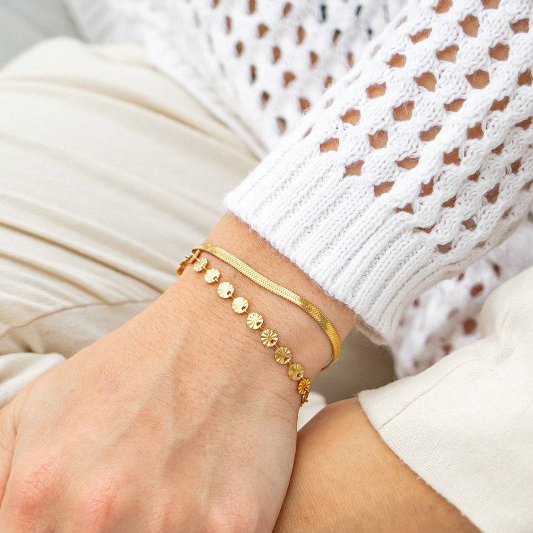 Minimalist gold disc bracelet stacked with bangles – tarnish-resistant waterproof jewelry by Lauren Riley Jewelry