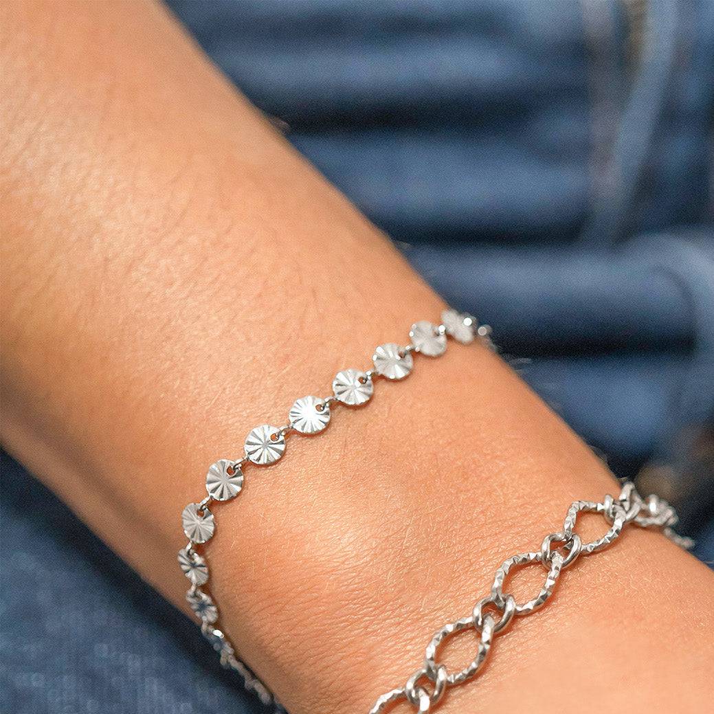Close-up of silver disc chain bracelet on wrist – waterproof, hypoallergenic, and stylish everyday jewelry from Lauren Riley Jewelry